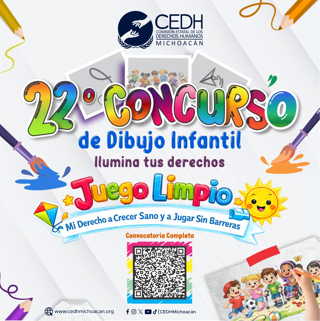 Morelia, Michoacán a 03 de febrero de 2026. Con el objetivo de que las infancias hagan valer su derecho a una convivencia sana, la Comisión Estatal de los Derechos Humanos de Michoacán, a través de la Unidad de Comunicación Social, publicó la convocatoria para la edición 22° del Concurso de Dibujo Infantil “Ilumina tus derechos”, que en esta ocasión tiene como tema “Juego limpio.